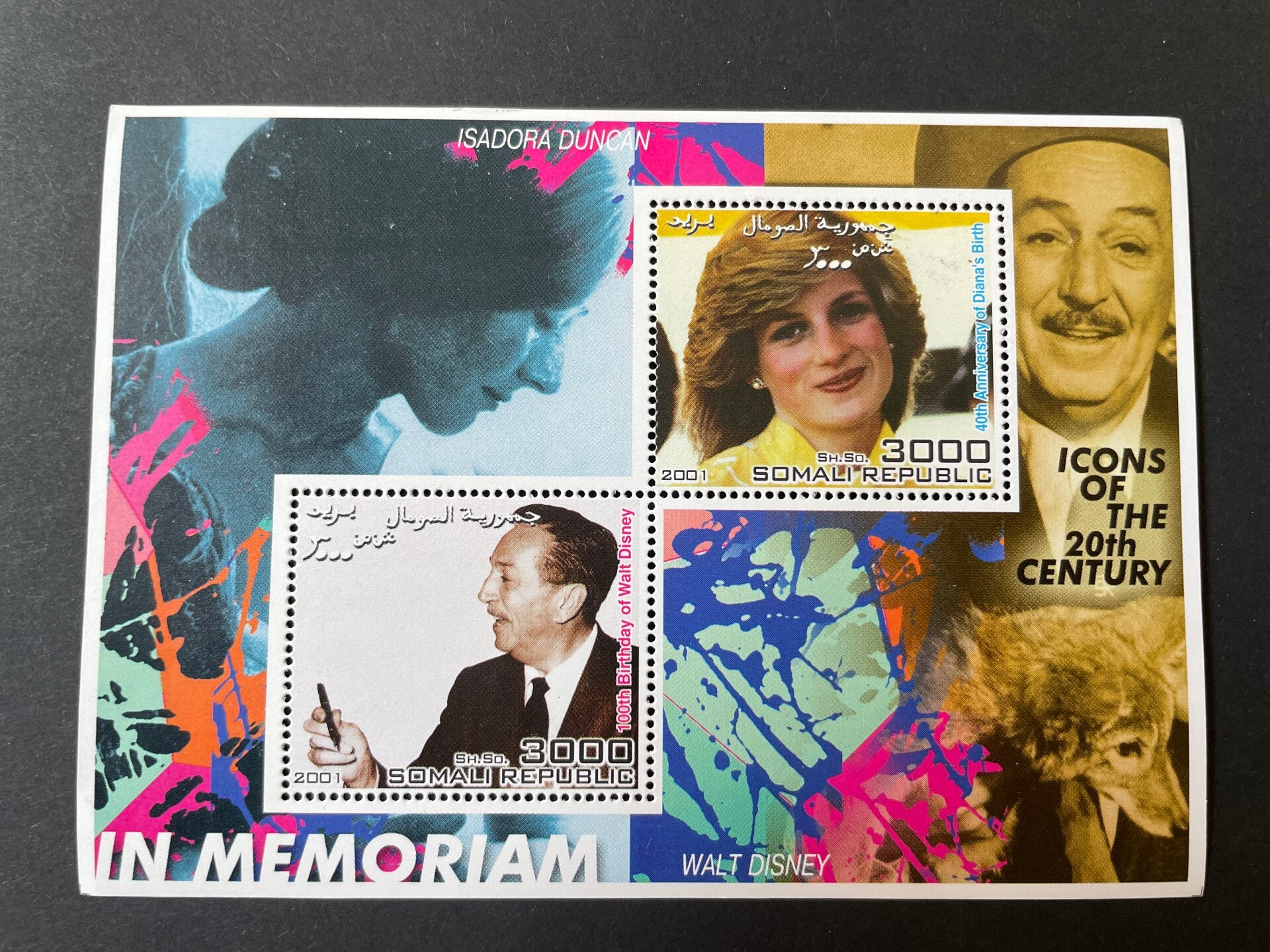 (SD) SOMALI REP. 2001 : LADY DIANA WALT DISNEY ISADORA DUNCAN - MNH VF S/S