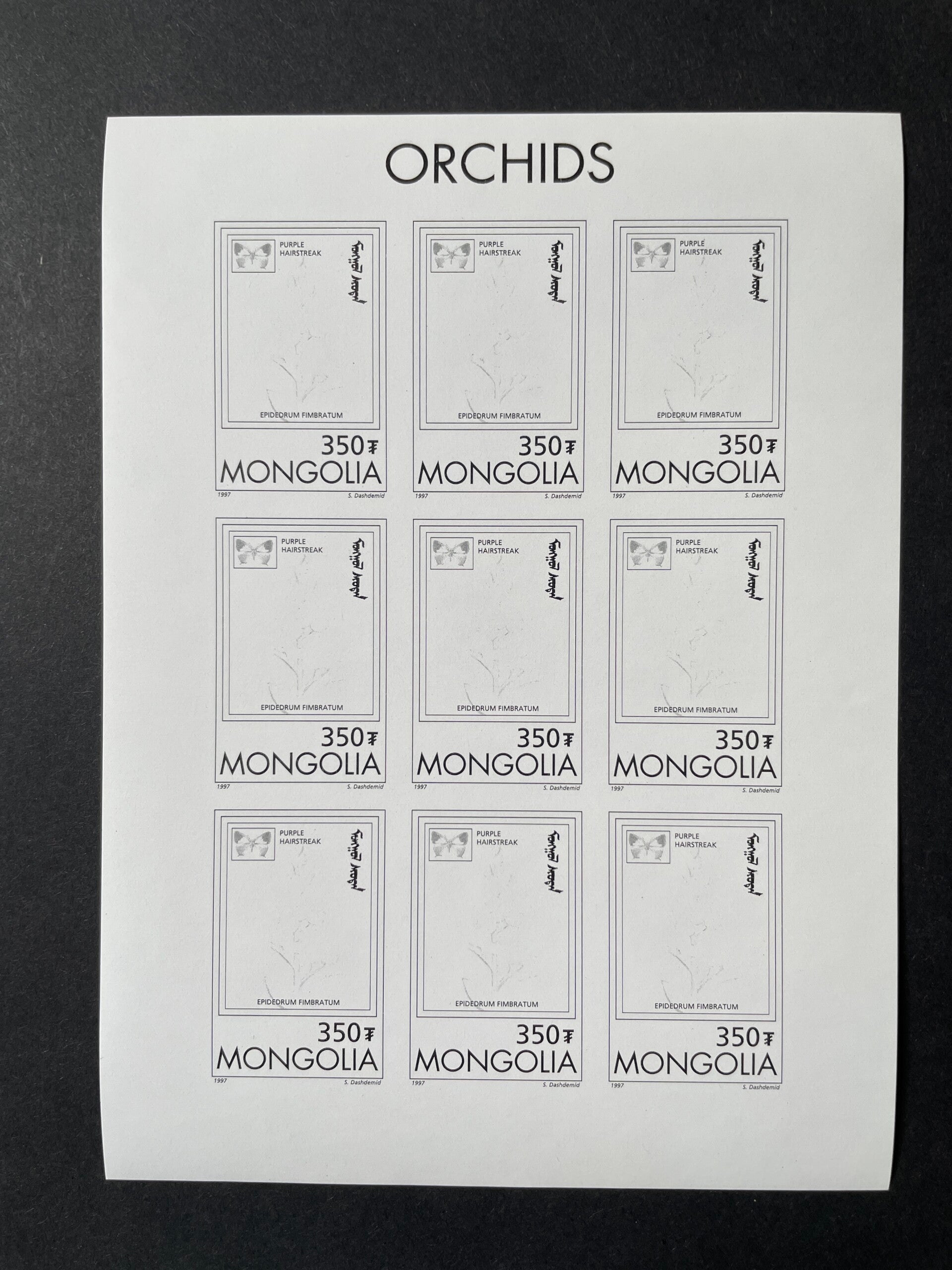 (39L) MONGOLIA 1997 : ORCHIDS - MNH VF COLOR PROOF BL/W SHEET OF 9 IMPERFO