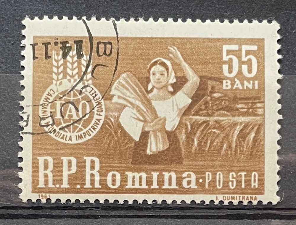 (3570) ROMANIA 1963 : Sc# 1537 FAO AGAINST HUNGER CAMPAIGN FARM WOMAN CORNFIELD COMBINE - VFU