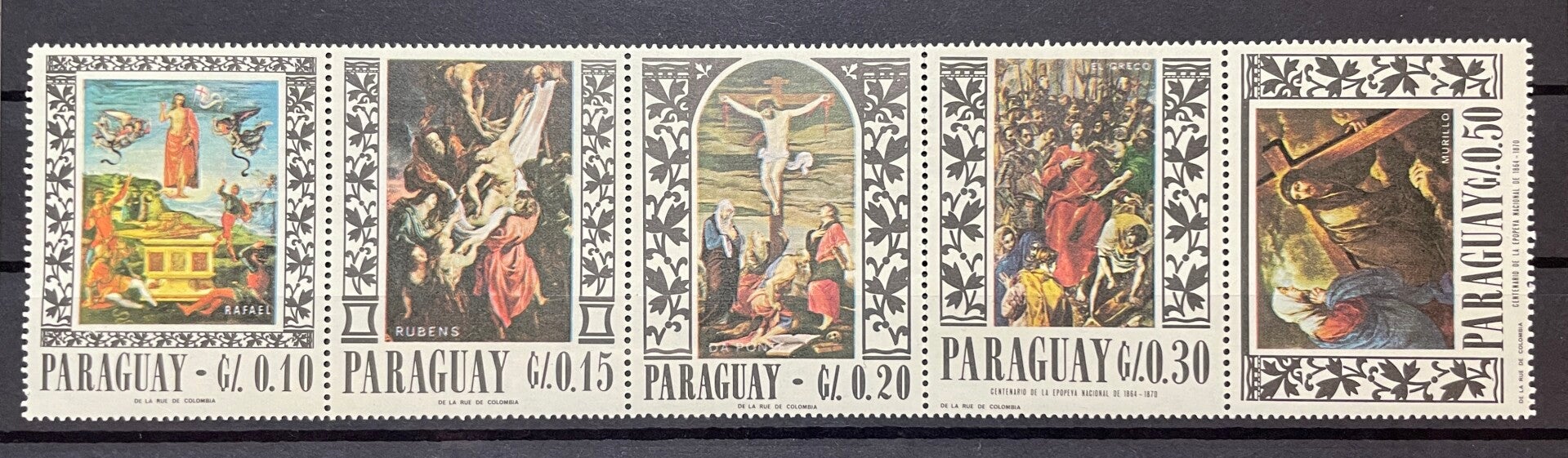 (1633L) PARAGUAY 1967 : Sc# 1004 PAINTINGS LIFE OF CHRIST BY RUBENS RAPHAEL ETC - MNH VF STRIP OF 5